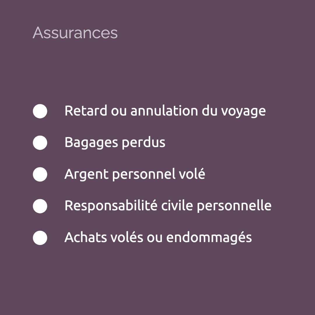 - Une assurance annulation et incidents de voyage, accidents, rapatriement, hospitalisation, recours juridique