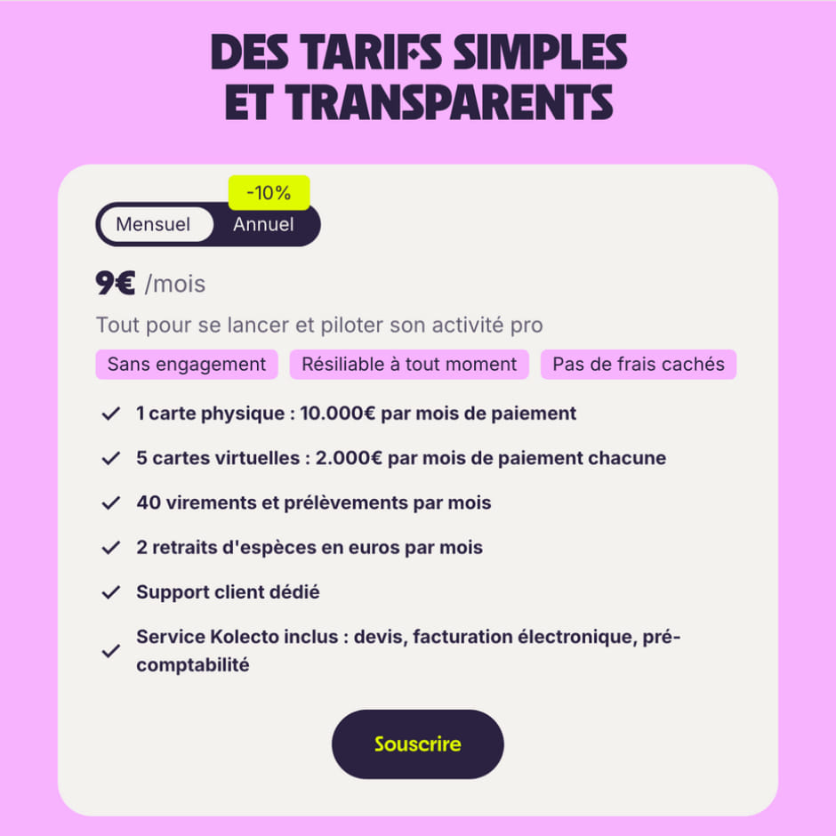 - L’offre inclut une carte physique Visa professionnelle et jusqu’à 5 cartes virtuelles gratuites. Vous bénéficiez également d’un outil de facturation intégré (Kolecto) pour gérer vos devis et factures électroniques en toute simplicité.