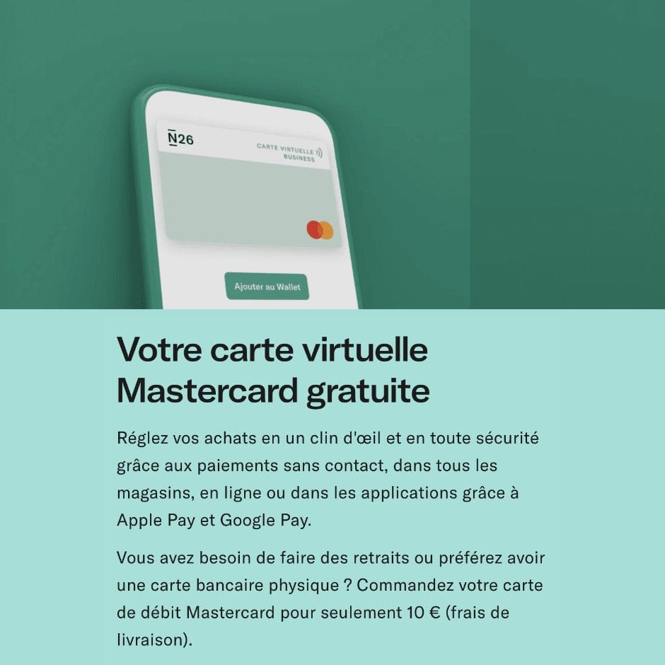 - 1 carte bancaire physique Mastercard (payante dans l'offre N26 Standard)