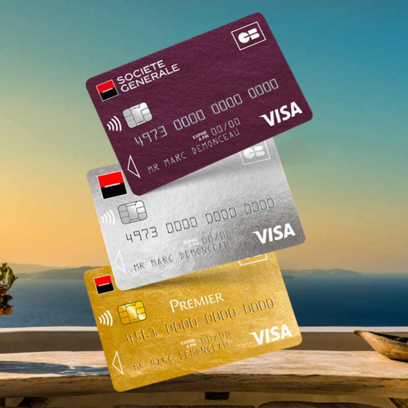 - 1 carte bancaire Visa ou Visa Premier au choix (voir tarifs). Personnalisation de la carte bancaire parmi un choix de 180 motifs.